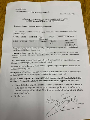 Ish-deputeti dhe ministër, Genc Pollo ka publikuar mbrëmjen e sotme formularin e firmosur pro thirrjes së Kuvendit Kombëtar të Partisë Demokratike.
