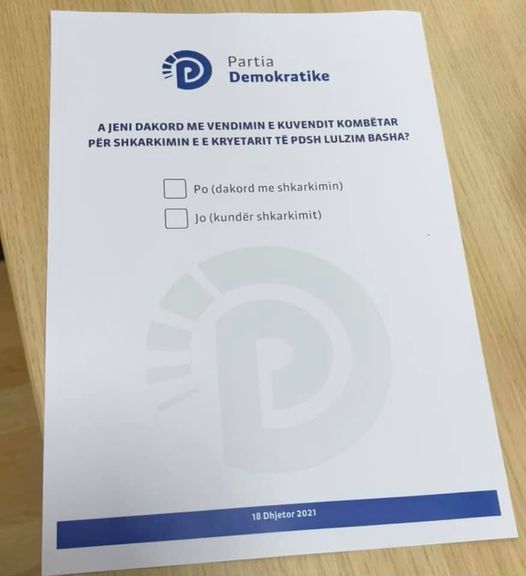 Fleta përmban një pyetje: A jeni dakord me vendimin e Kuvendit Kombëtar për shkarkimin e kryetarit të PDSH, Lulzim Basha.