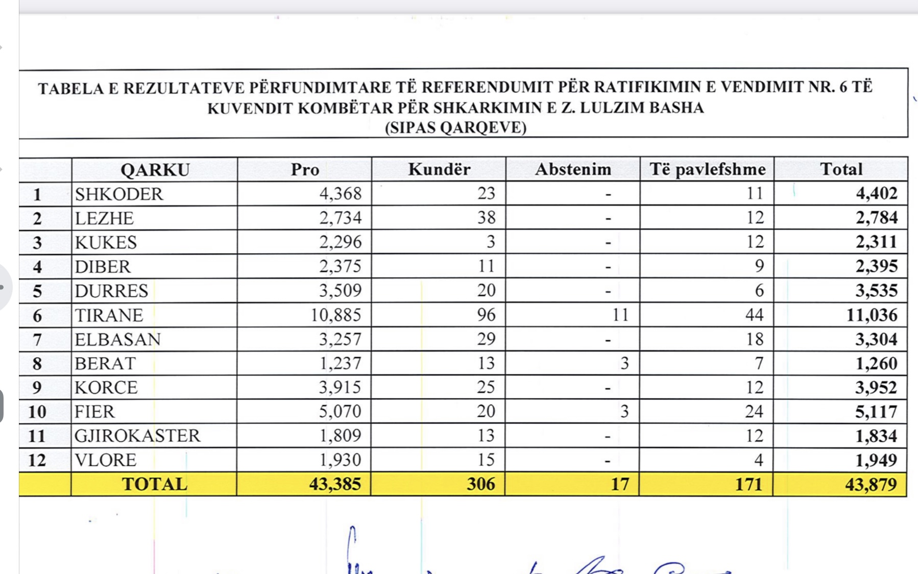 Në bazë të këtij referendumi është ratifikuar vendimi numër 6 i Kuvendit Kombëtar për shkarkimin e Lulzim Bashës, thuhet në vendimin e referendumit firmosur nga komisioni elektoral i përcaktuar nga kuvendi kombëtar i PD më 11 janar. a.b