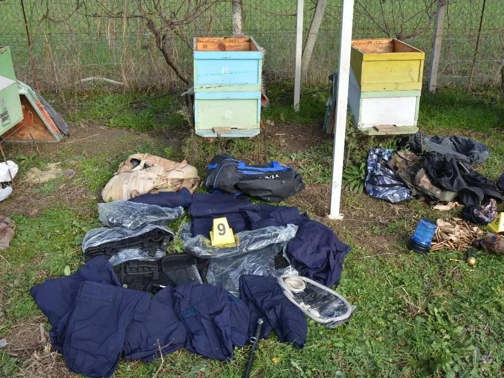 • 2 armë zjarri automatike, 1 silenciator, rreth 7 mijë fishekë luftarakë të kalibrave të ndryshëm, për armë të lehta dhe të rënda, 85 predha eksplozive, 1 thikë bajonetë, 9 uniforma policie, 7 jelekë multifunksionalë, 11 kapele policie, 2 radio policie, fenelina policie, maskë gome për fytyrën dhe dokumente të ndryshme.