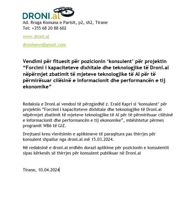 Vendimi për fituesit për pozicionin ‘konsulent’ për projektin “Forcimi i kapaciteteve dixhitale dhe teknologjike të Droni.al nëpërmjet zbatimit të mjeteve teknologjike të AI për të përmirësuar cilësinë e informacionit dhe performancën e tij ekonomike”