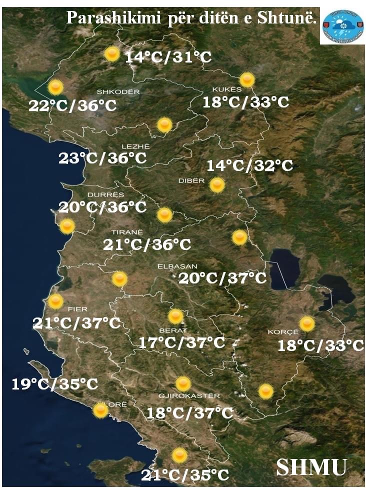 Në zonat bregdetare temperaturat do të jenë nga 20-36 gradë celsius. Ndërsa në zonat malore 18-31 grafë celsius. a.b