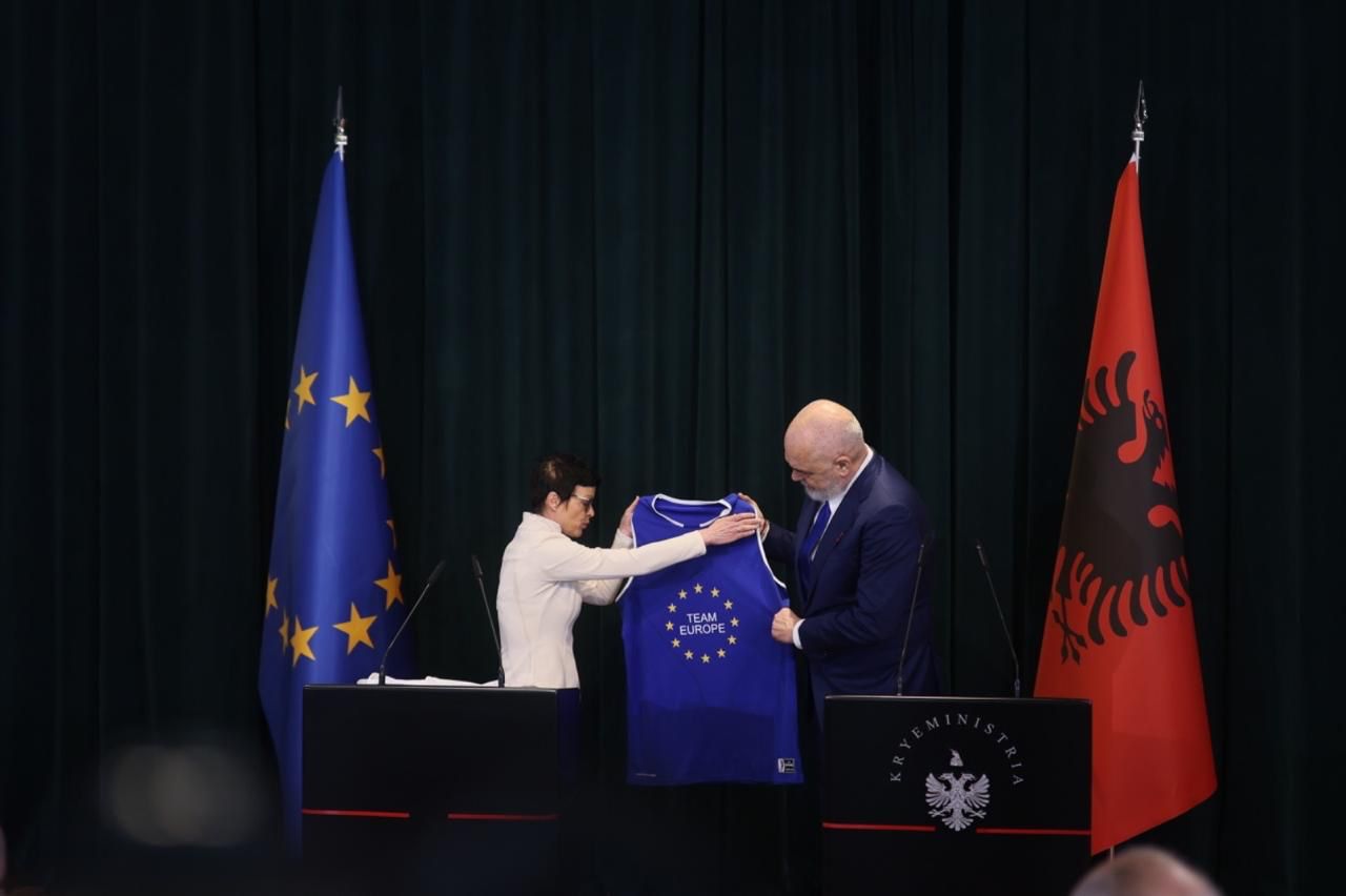 Në një gjest simbolik, Kos i dhuroi Ramës një fanellë sportive me numrin 11, duke theksuar se Shqipëria është pjesë e “skuadrës europiane” dhe se anëtarësimi i saj do ta bëjë BE-në më të fortë. Ajo madje premtoi se do të ngjitet në majën më të lartë të Shqipërisë, malin e Korabit, kur vendi të përmbyllë procesin e negociatave.