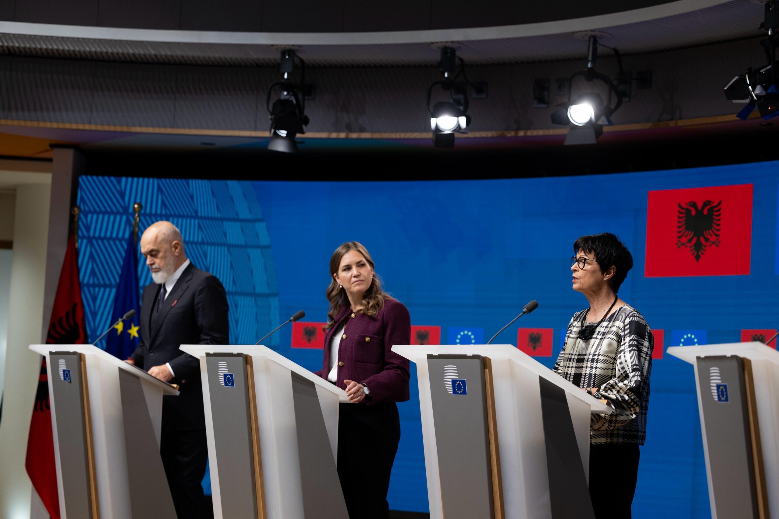 Pas hapjes së grupkapitujve të gjashtë në Bruksel u mbajt një konferencë e përbashkët e Kryeministrit Edi Rama me Marie Bjerre, Ministre e Çështjeve Europiane, Mbretëria e Danimarkës dhe Marta Kos, Komisionere Europiane për Zgjerimin.